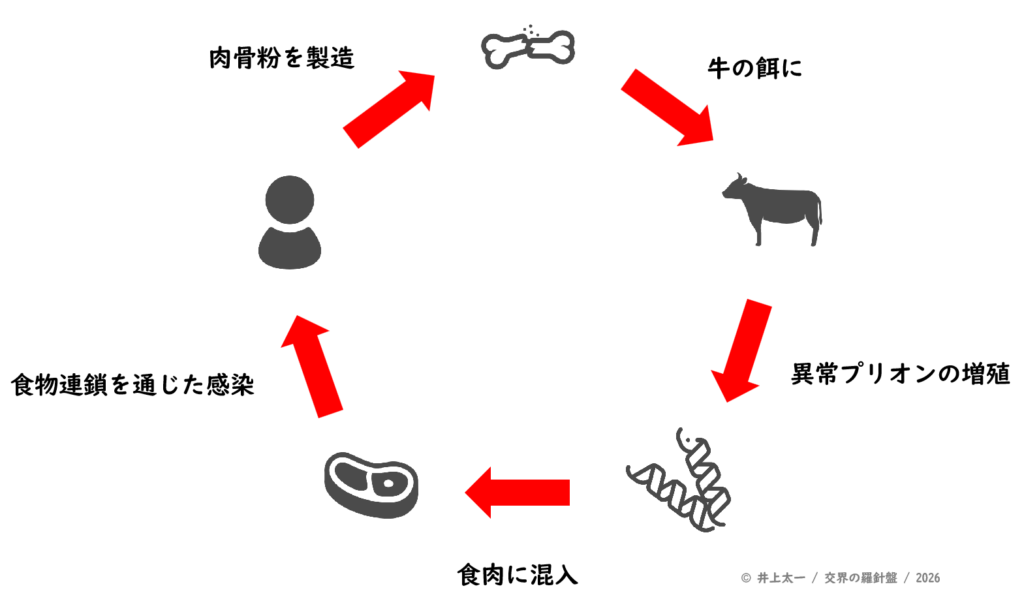 BSEに感染した牛を人間が摂取すると、変異型クロイツフェルト・ヤコブ病(vCJD)を発症する可能性がある。牛本来の食性を無視した人為的介入は、動物と人間の双方に深刻な公衆衛生危機をもたらした。