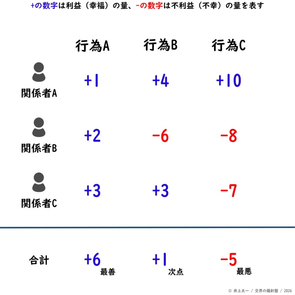 最大多数の最大幸福とは、行為の影響によって関係者にもたらされる利益や不利益(幸福や不幸)を合算した時、利益の値が最大となる行為を最善とする考え方である。